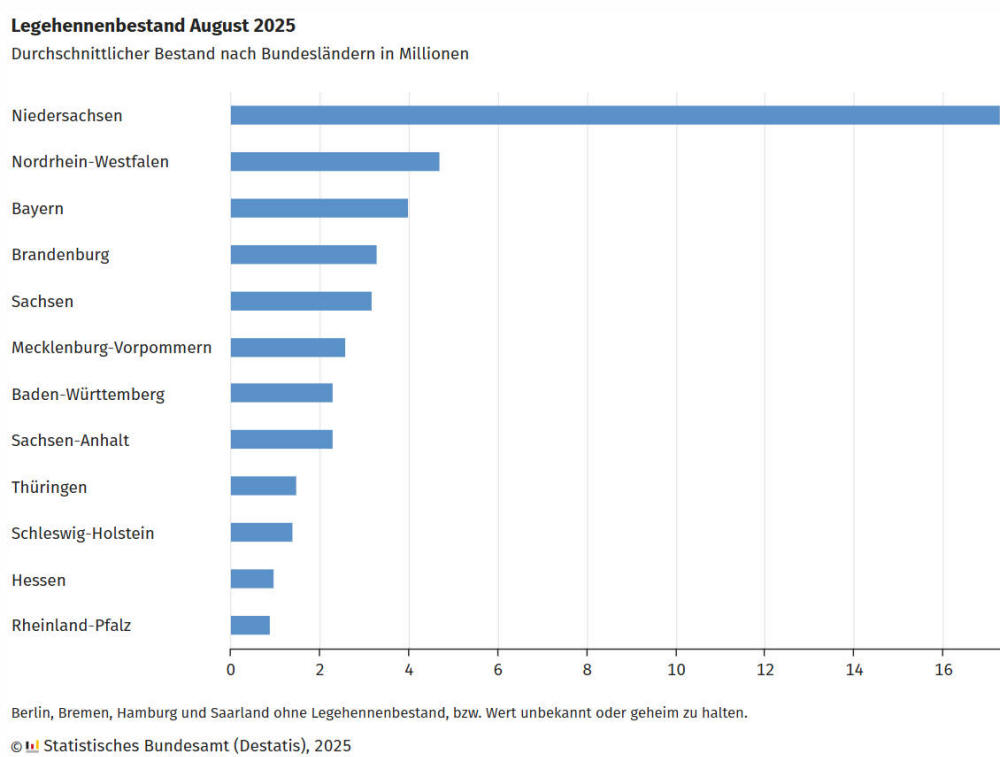 Legehennen im August 2025, die meisten davon in Niedersachsen, NRW