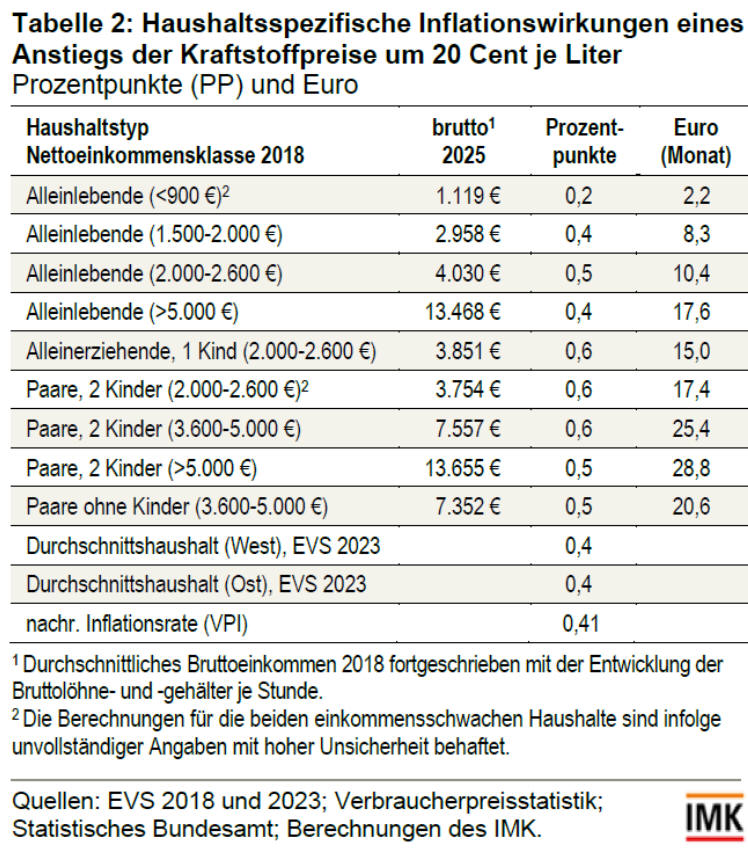 Aktuell abschätzen lässt sich, wie stark sich eine Verteuerung der Kraftstoffpreise auf die haushaltsspezifischen Inflationsraten auswirkt und wie hoch die Kosten bei unverändertem Verbrauch ausfallen. Inflationsexpertin Tober hat das berechnet: Ausgehend von dem Niveau im Februar 2026 steigert ein Anstieg der Kraftstoffpreise um 20 Cent je Liter – Super E10 auf 1,96 Euro pro Liter und Diesel auf 1,92 Euro pro Liter – die allgemeine Inflationsrate direkt um 0,41 Prozentpunkte.