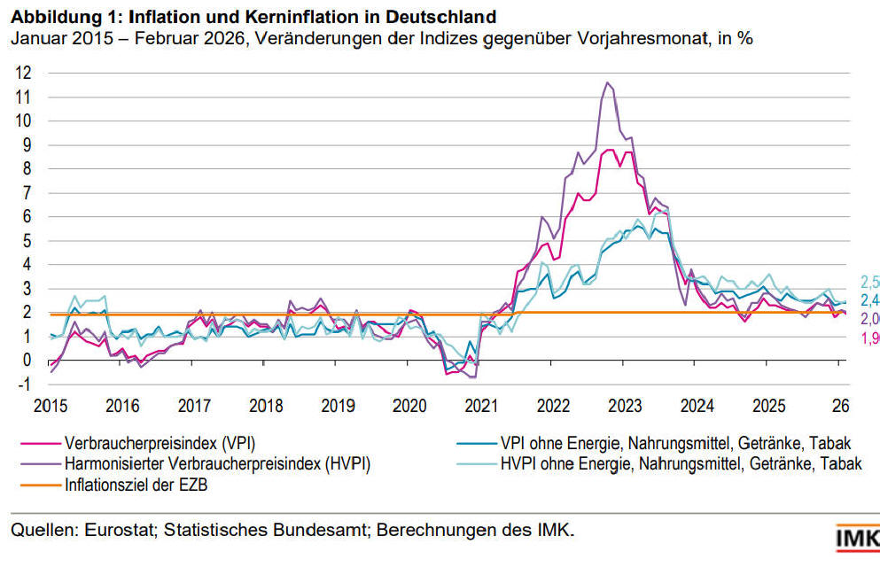 Im Januar waren es noch 2,1 Prozent gewesen. Der Rückgang beruhte vor allem auf weniger stark steigenden Lebensmittelpreisen. Die Energiepreise dämpften die Inflation im Februar zwar ebenfalls noch, wegen bereits höherer Preisdynamik bei Kraftstoffen aber schon in geringerem Maße als Ende vergangenen Jahres zu erwarten war. Blickt man auf die Inflationsraten von neun exemplarischen Haushaltstypen, die sich nach Einkommen und Personenzahl unterscheiden, lagen acht unter zwei Prozent, einer genau auf dieser Marke.