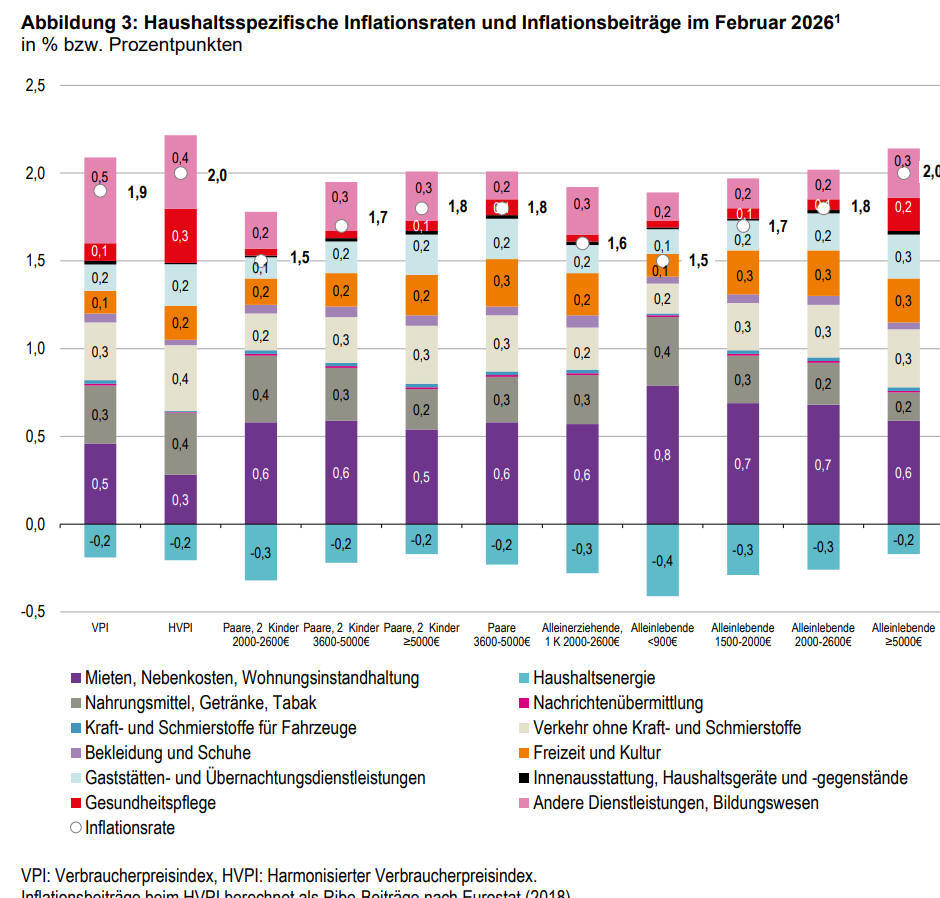 So hatten Familien und Alleinlebende mit jeweils niedrigen Einkommen im Februar mit je 1,5 Prozent im Haushaltsvergleich die niedrigste Inflationsrate. Am anderen Ende des Haushaltsvergleichs standen – mit relativ geringem Abstand – „einkommensstarke“ Alleinlebende mit sehr hohen Einkommen, deren Inflationsrate bei 2,0 Prozent lag. Die Inflationsraten der übrigen sechs Haushaltstypen mit überwiegend mittleren Einkommen lagen mit 1,6 bis 1,8 Prozent dazwischen und knapp unter der EZB-Zielinflationsrate.