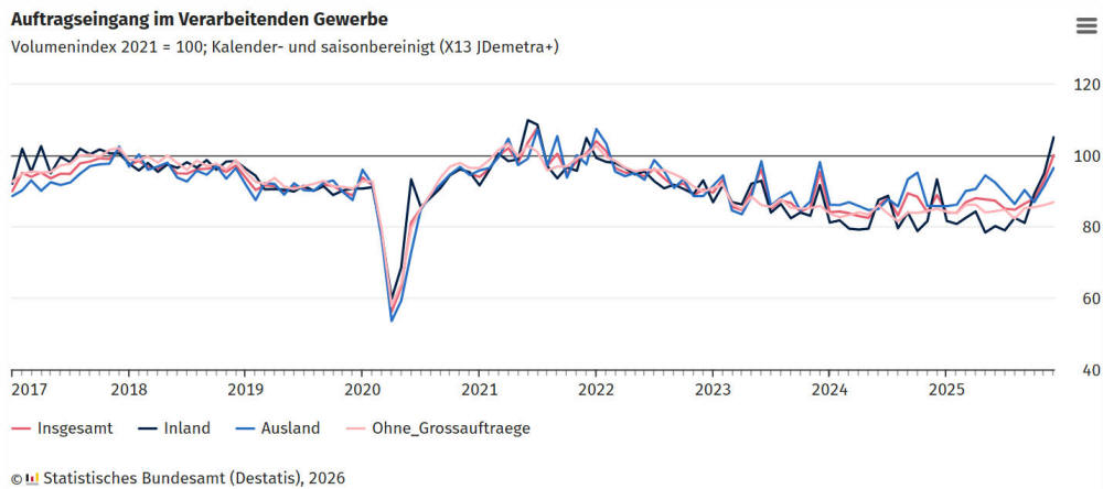 Die Auslandsaufträge stiegen im Dezember 2025 um 5,6 %. Dabei fielen