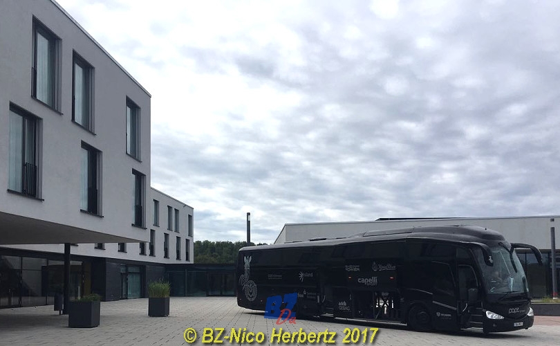 Bewölkt, aber immerhin trocken. Der Mannschaftsbus steht