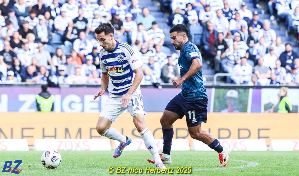 Der MSV, in den blau-weiß quergestreiften Trikots, spielt von links