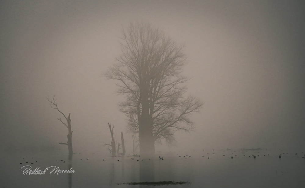 düstere Stimmung mit Kopfweiden im Nebel vorgefunden, die