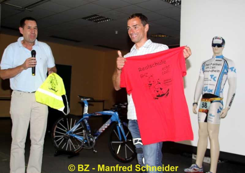 Konrektor Elmar Sudeick überreichte Andreas Niedrig ein T-Shirt des GHZ, über das sich dieser offensichtlich freute