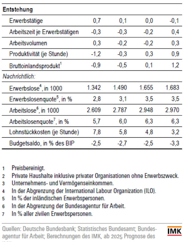 Gleichzeitig wächst die globale Konkurrenz durch chinesische Unternehmen, während die Nachfrage aus China schwach bleibt. Zusätzlich bremsend wirkt die Aufwertung des Euro gegenüber Dollar und Renminbi. Da der Arbeitsmarkt zeitversetzt reagiert, bringt das anziehende Wachstum noch keine Wende bei Erwerbstätigkeit und Arbeitslosigkeit.