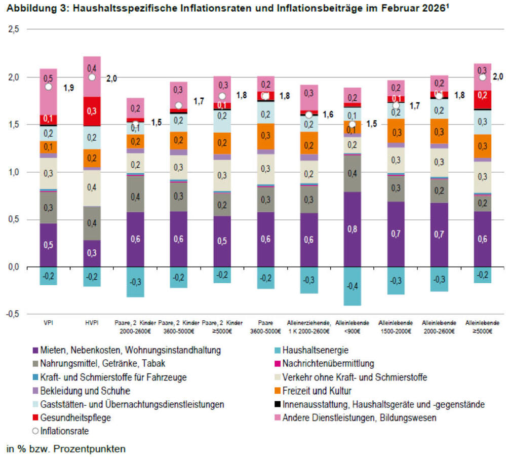 Im Januar waren es noch 2,1 Prozent gewesen. Der Rückgang beruhte vor allem auf weniger stark steigenden Lebensmittelpreisen. Die Energiepreise dämpften die Inflation im Februar zwar ebenfalls noch, wegen bereits höherer Preisdynamik bei Kraftstoffen aber schon in geringerem Maße als Ende vergangenen Jahres zu erwarten war. Blickt man auf die Inflationsraten von neun exemplarischen Haushaltstypen, die sich nach Einkommen und Personenzahl unterscheiden, lagen acht unter zwei Prozent, einer genau auf dieser Marke.