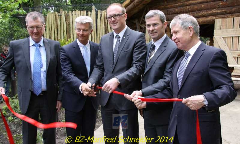 Zoo-Direktor Achim Wilkler(2.v.re.)vor der Lärchenholz-Blockhütte. OB Sören