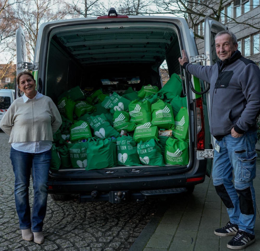 Mitarbeiter des DVV-Konzerns die Weihnachtstaschen für die Tafel
