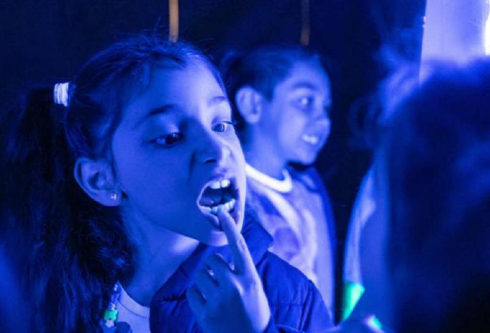 Tollberg in Wanheim das Thema Mundgesundheit. Im Schwarzlicht werden