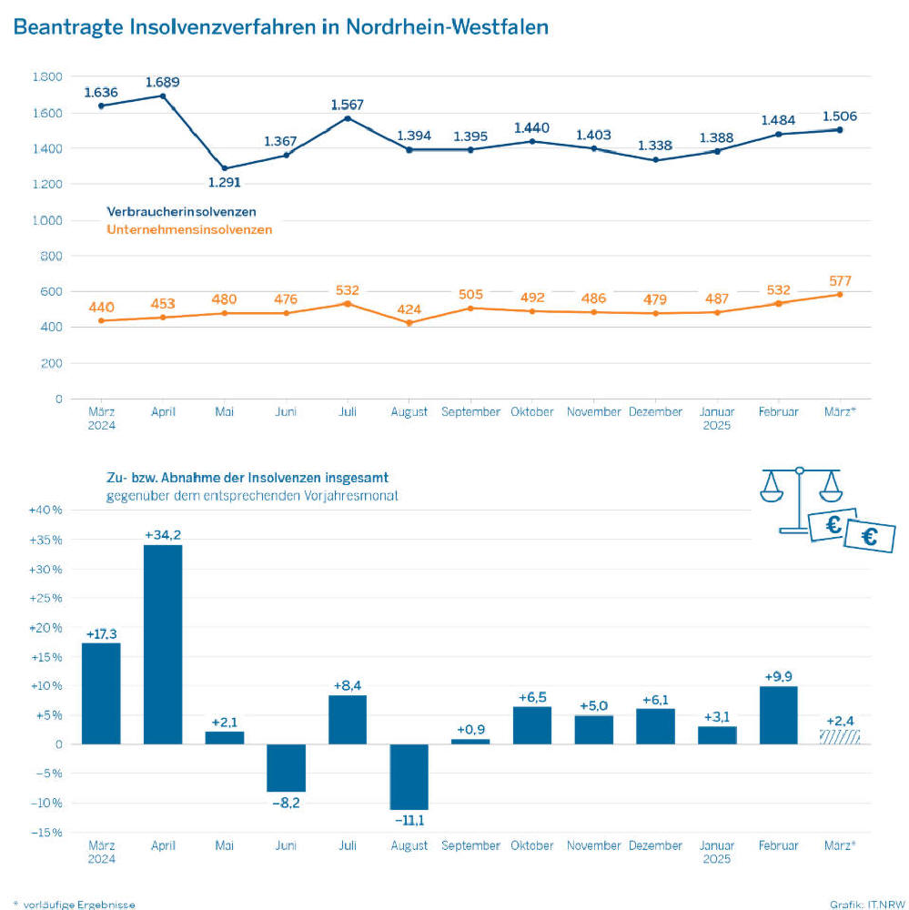 gemeldeten Insolvenzverfahren in NRW war im März 2025 mit 2.616
