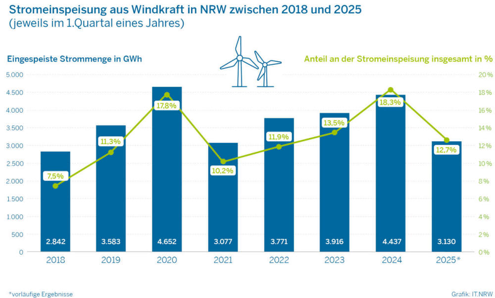 NRW: Stromeinspeisung aus Windkraft im 1. Quartal