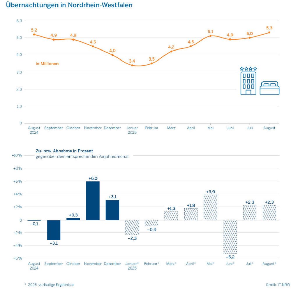 Gästeankünfte und 2,3 % mehr Übernachtungen als im August 2024. *