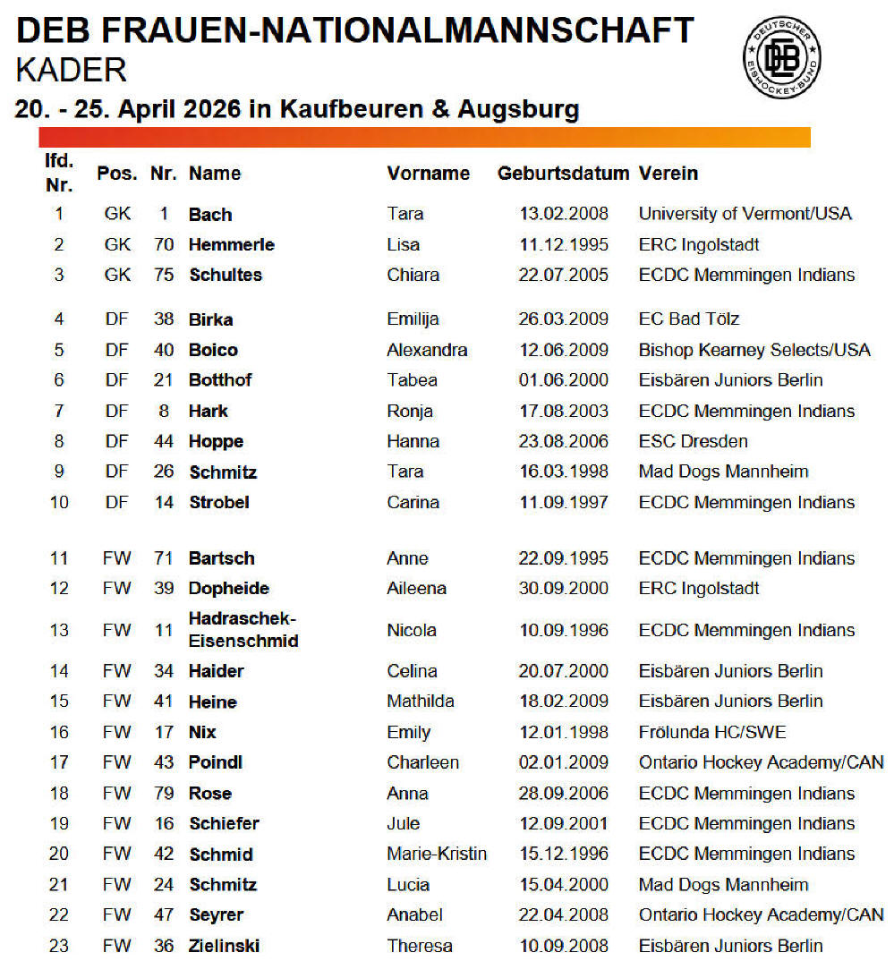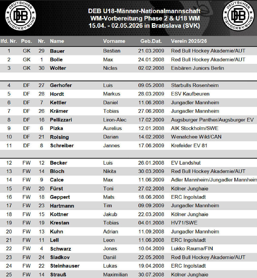 Deutsche Eishockey Bund e.V. (DEB) hat das Aufgebot der