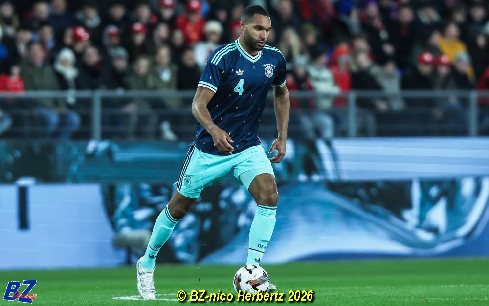 Wucht den Zweikampf gegen Tah und wuchtet das Leder mit dem