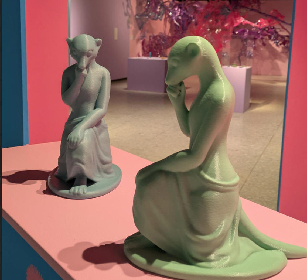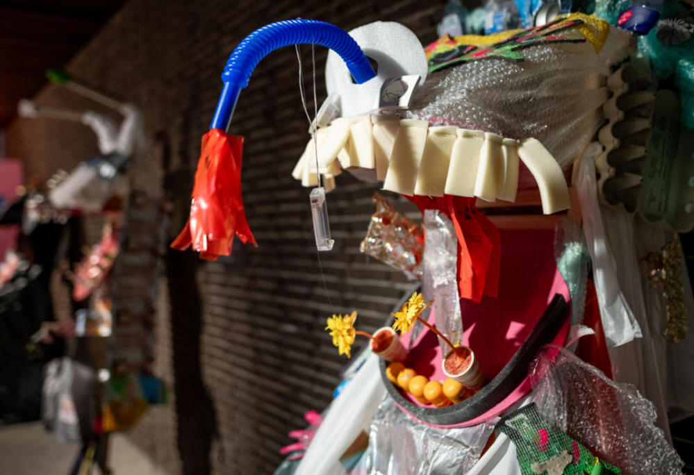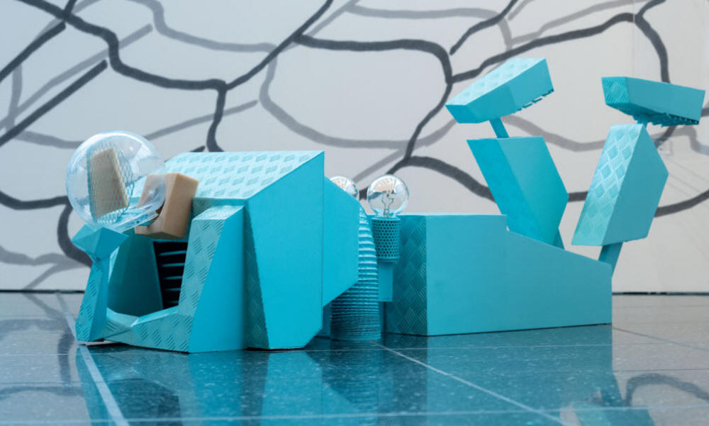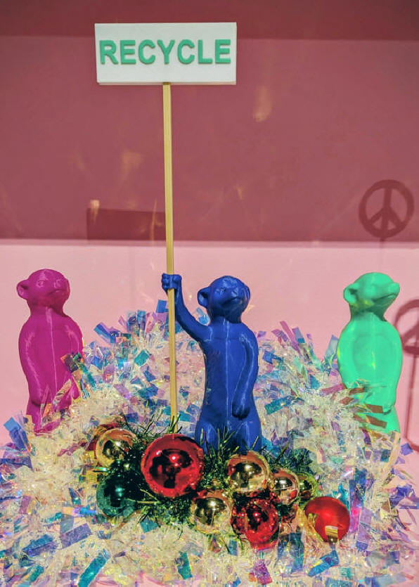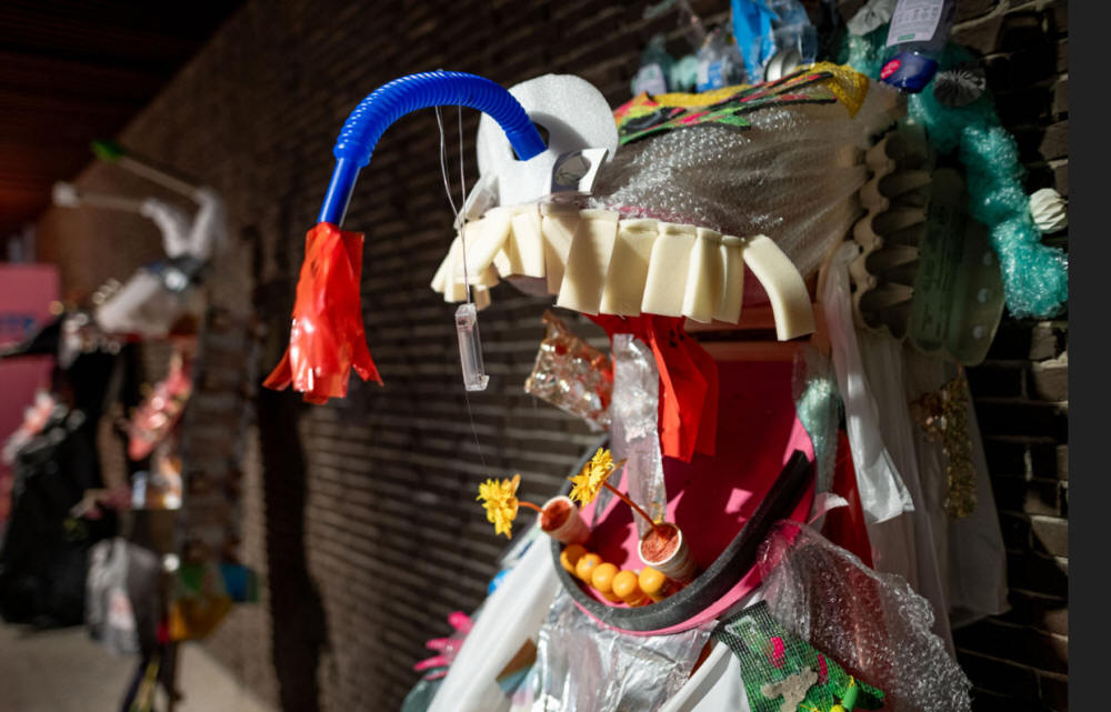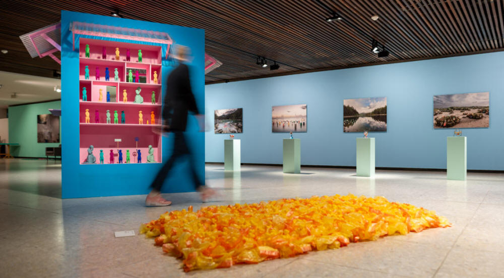 Ausstellung auf, indem Plastikmüll zu kreativem Material